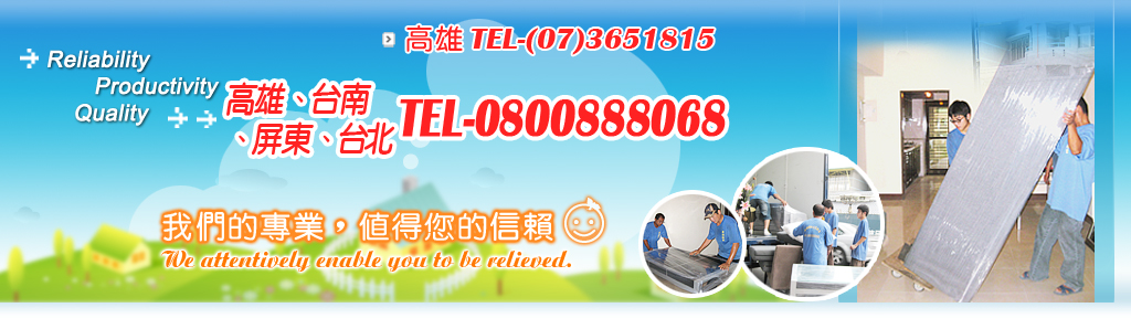 |  一般家庭搬遷公司(廠)、學校、拆裝服務、精緻包裝、廢棄物處理、北.中.南回頭車。 精搬: 鋼琴、機械、電腦、金庫、傢俱、藝品、精密儀器、百貨公司櫥櫃、冷氣拆卸。 |